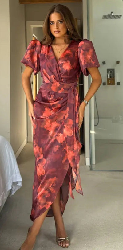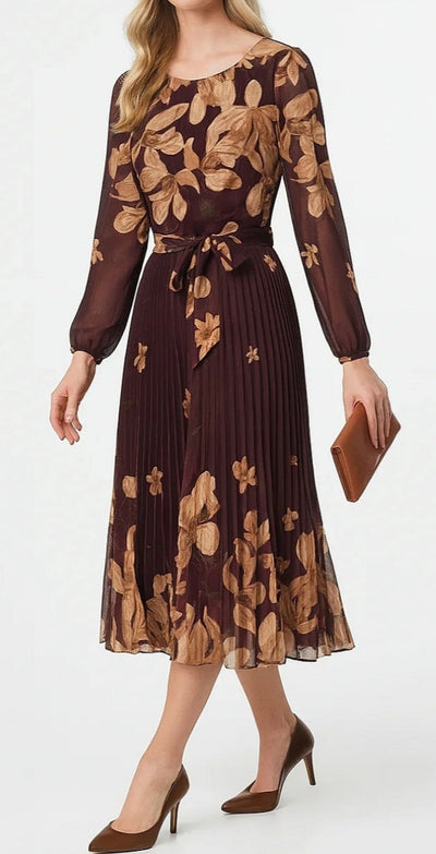 Ladies Elegant Floral print pleated midi dress -burgundy