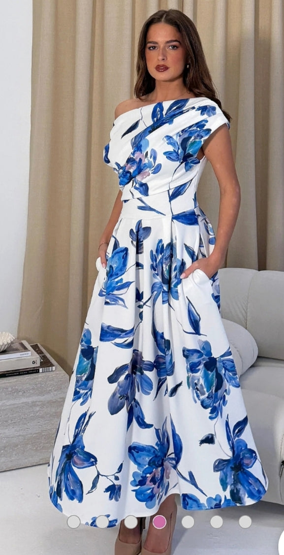 Ladies Elegant floral print Betty midi dress - blue