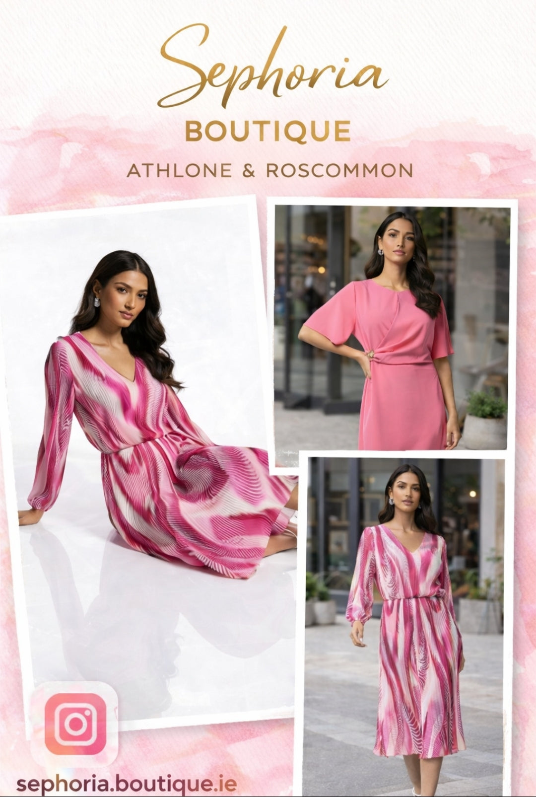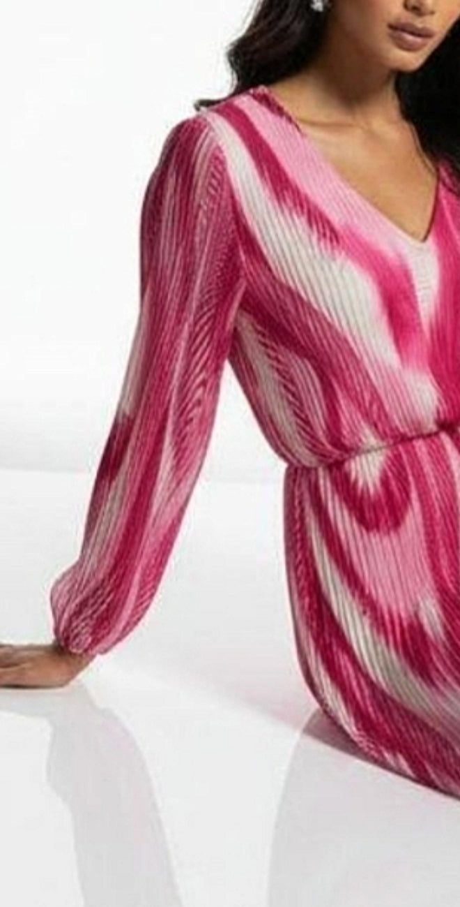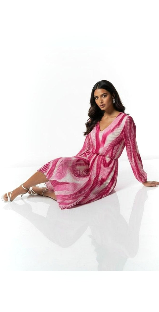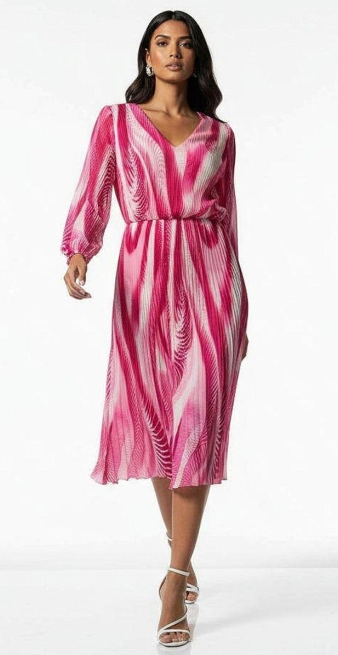 Ladies Elegant print V.neck midi dress in pink