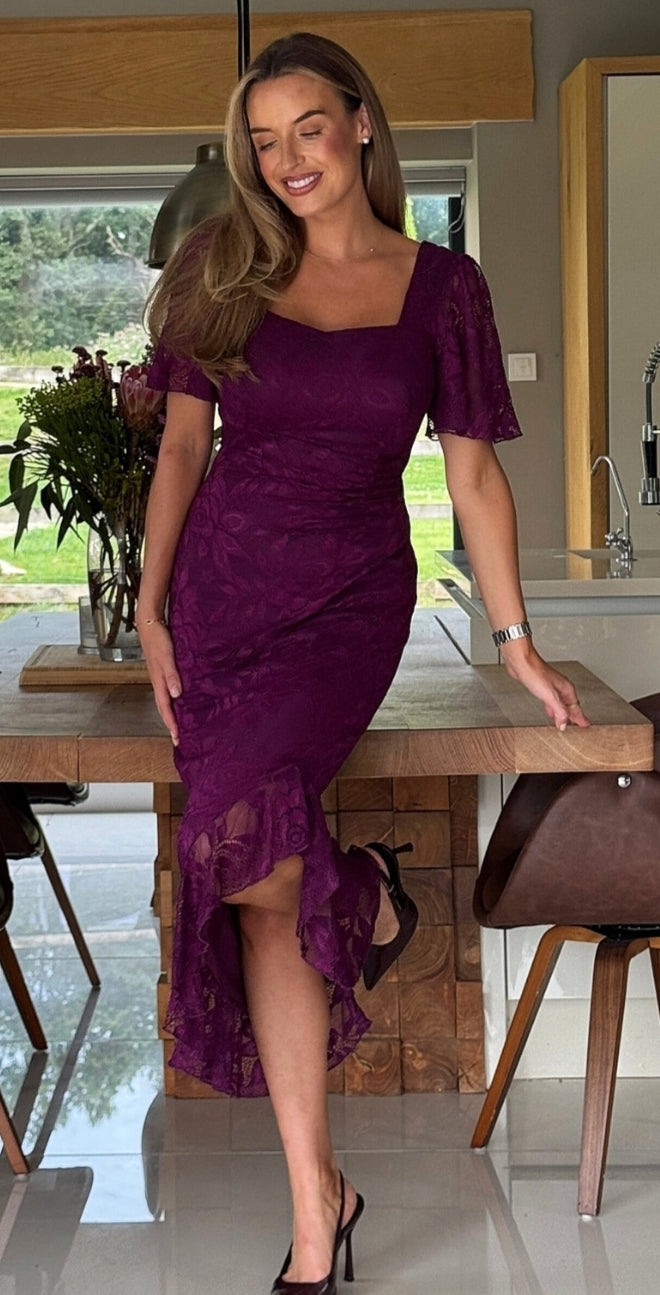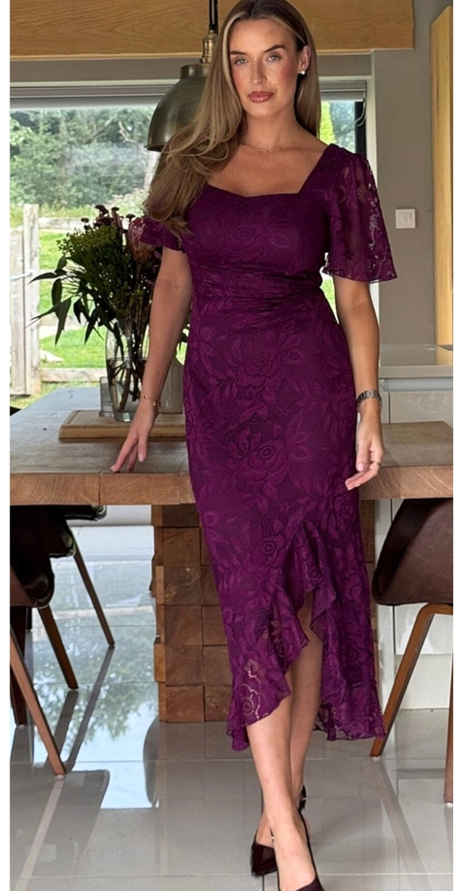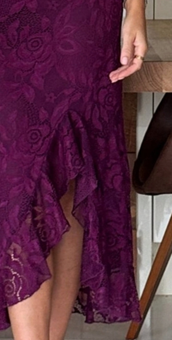 Ladies ruched lace midi dress in plum