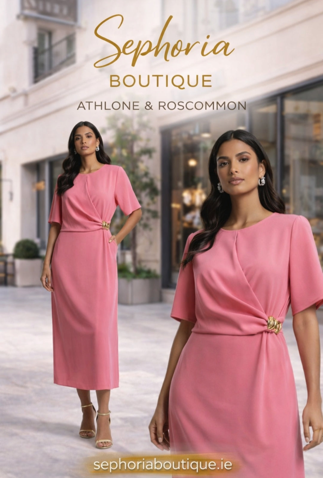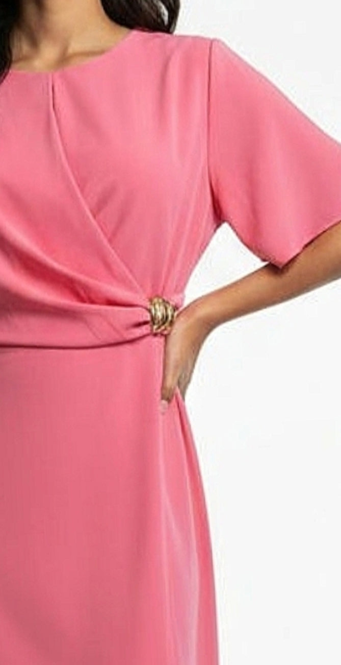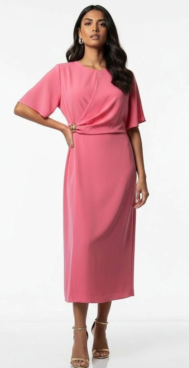 Ladies soft feminine round neck crossover draped midi dress in pink