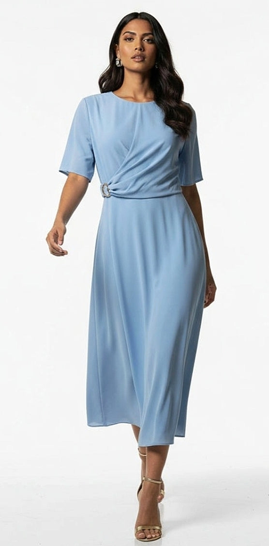 Ladies soft feminine round neck crossover draped midi dress in powder blue