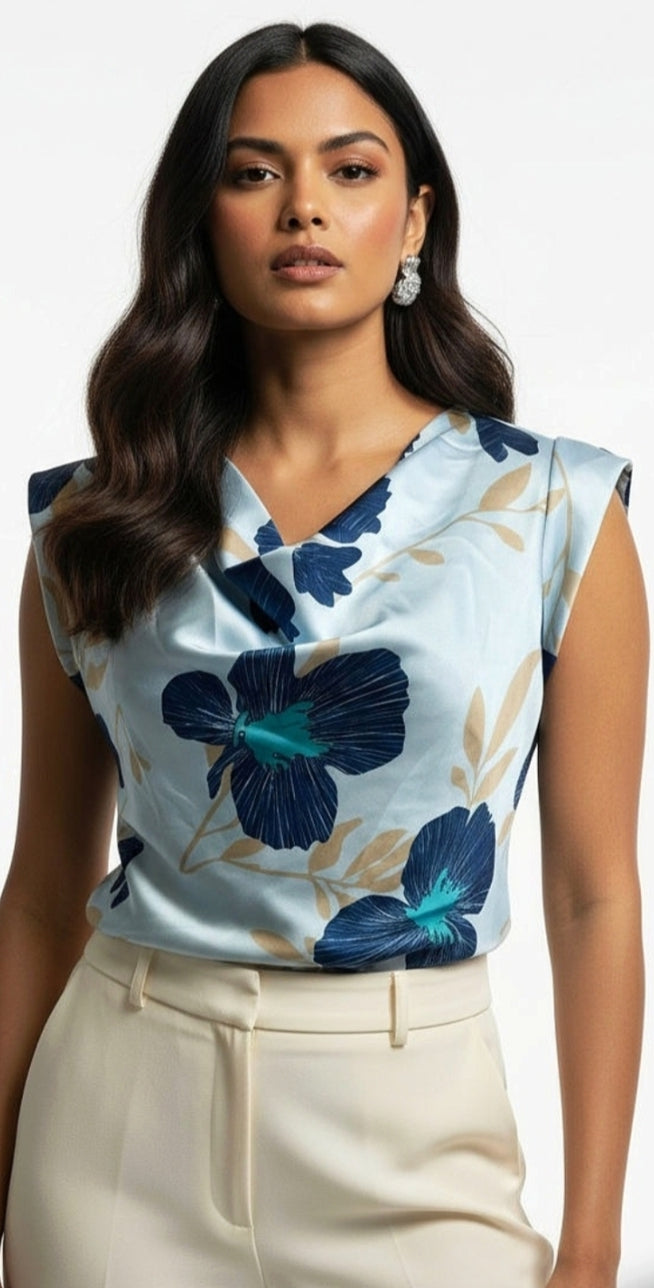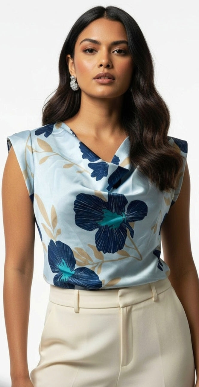 Ladies cowl neck sleeveless floral print top- Powder blue