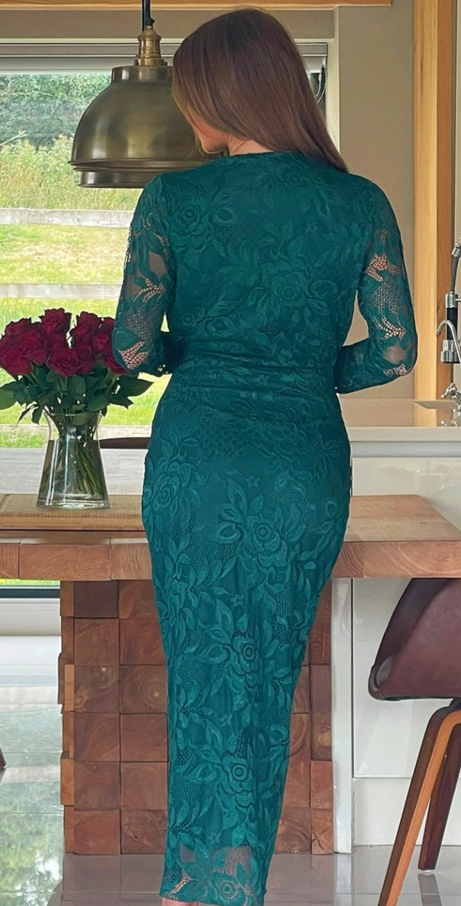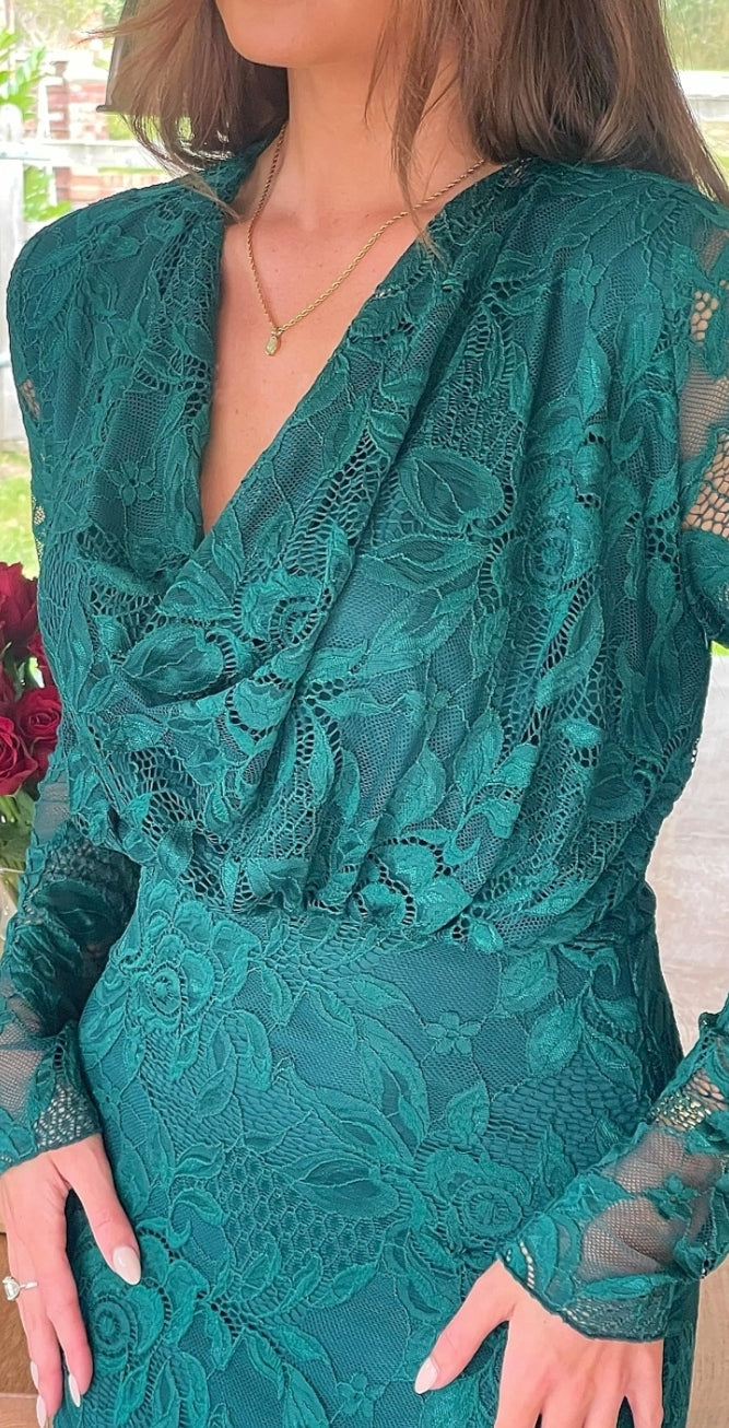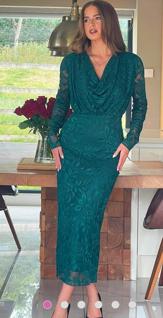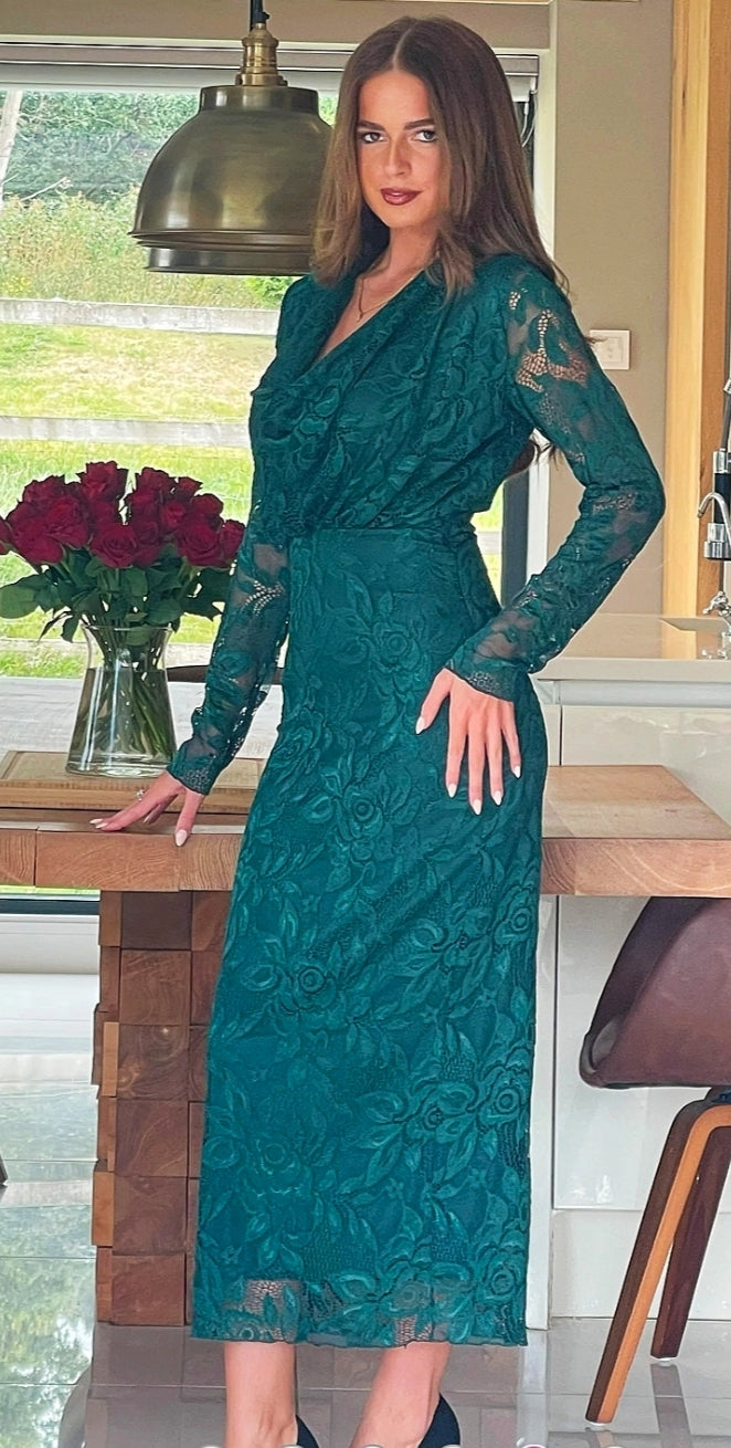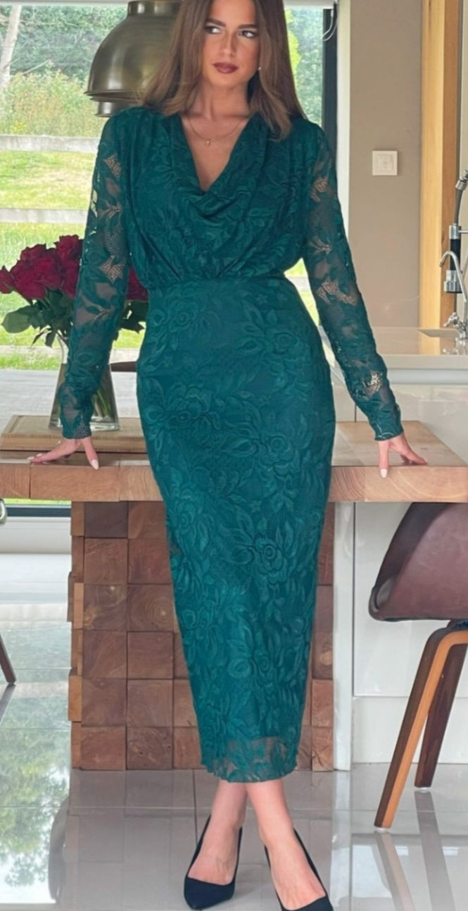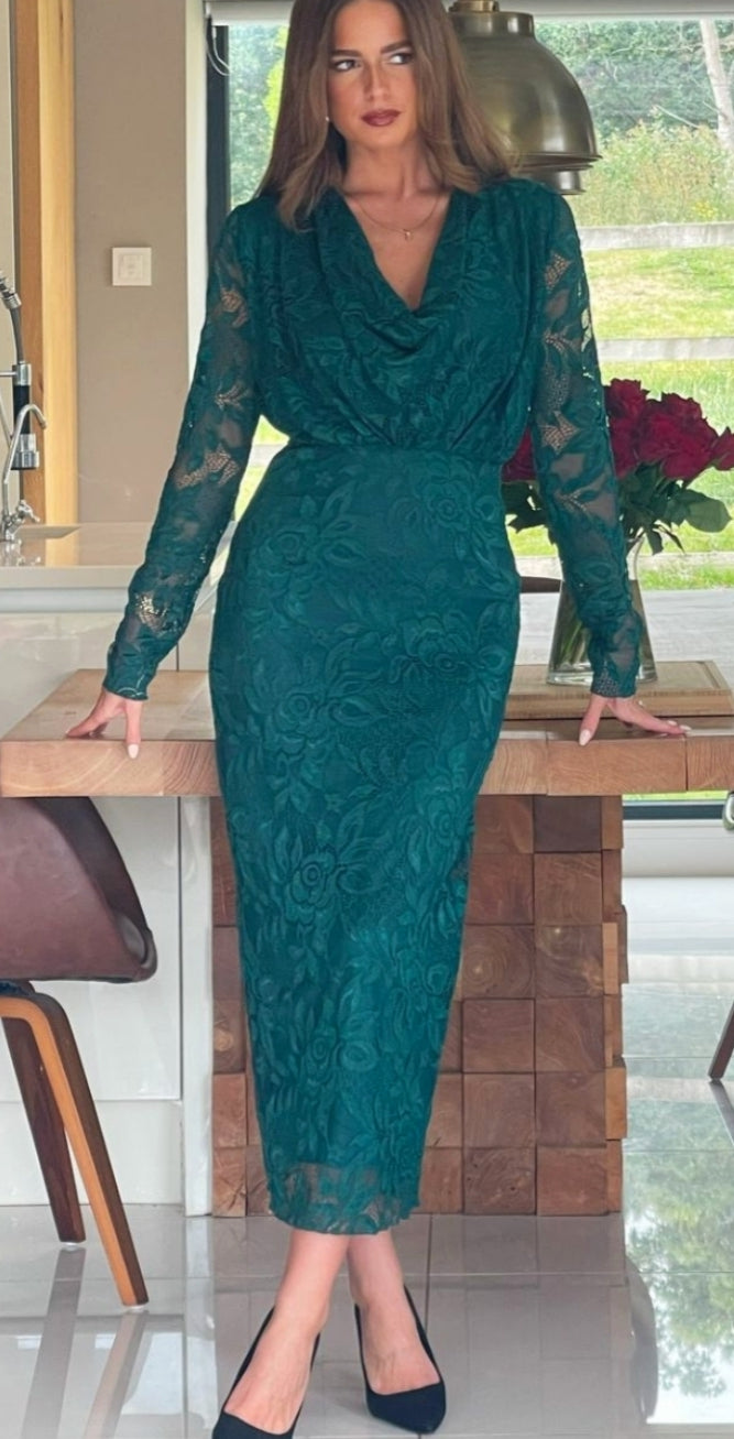 Ladies Elegant Cowl neck lace midi dress in forest green
