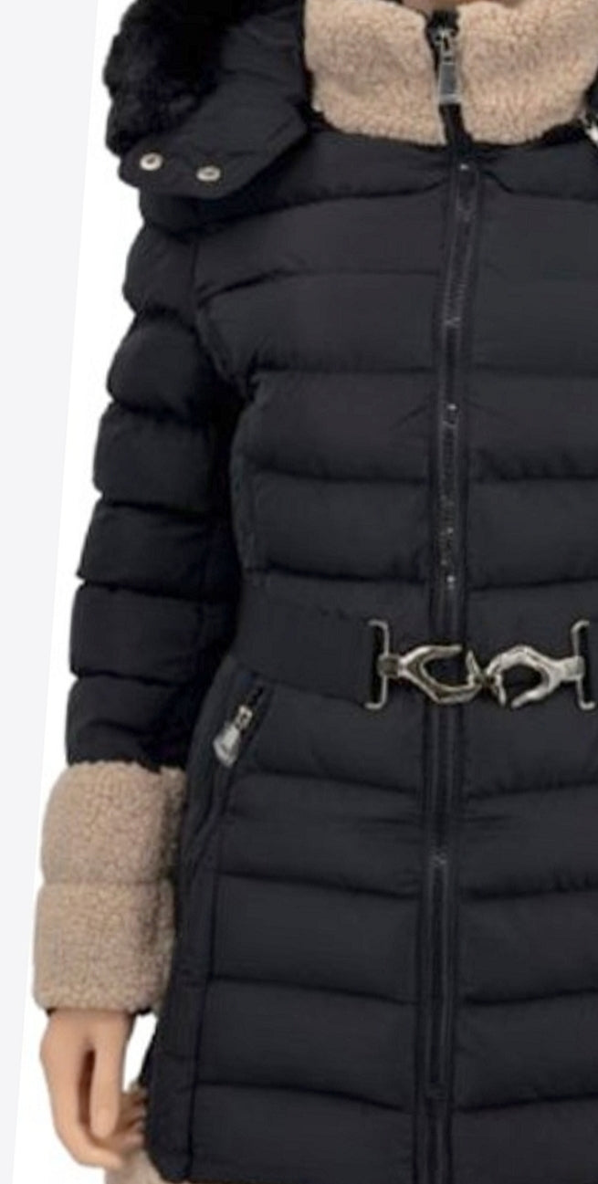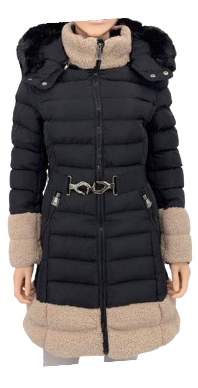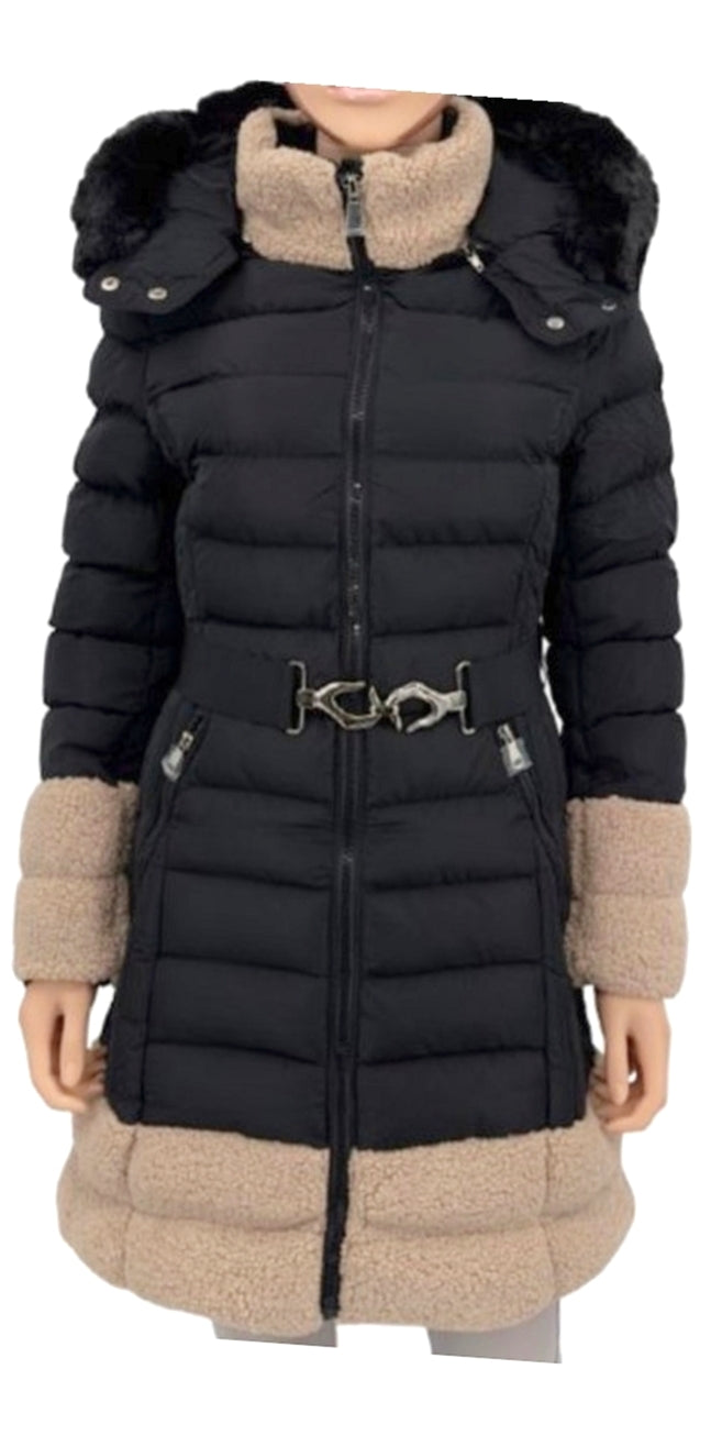 Ladies longline puffer coat black/beige